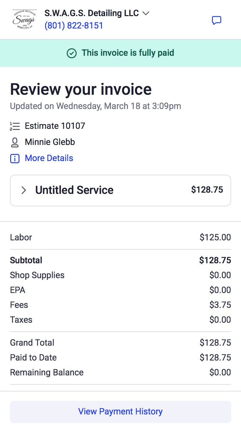 | #9 | 2026-03-18 | S.W.A.G.S. Detailing | $128.75 R | 10107 | Other | ✓ Reviewed | |||